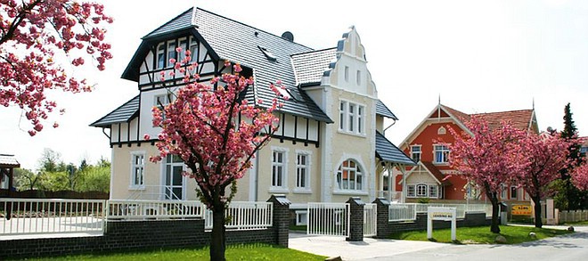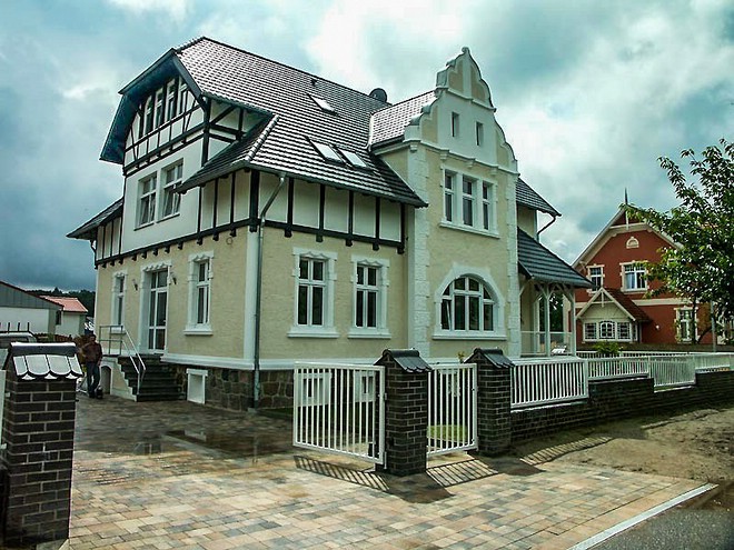 UUmbau einer nicht mehr für Wohnzwecke genutzten Villa aus dem Baujahr 1905 zu einem Bürogebäude mit Einliegerwohnung bzw. Zimmervermietung für einen örtlichen Finanzdienstleister. Die baulichen Veränderungen der letzten Jahrzehnte an der Fassade wurden zurück gebaut und erforderliche Änderungen an der Fassade aufgrund der neue angelegten Raumstruktur im Gebäude wurden im bauzeitlichen Stiel ausgeführt, so dass das Gebäude wieder markant als glanzvolle Jugendstilvilla erkannt wird.